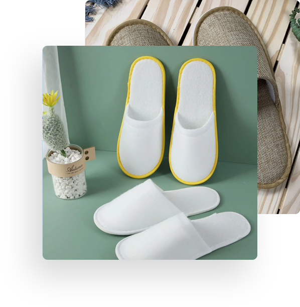 產品有高檔割絨、華夫格拖鞋,各種粗細毛巾拖鞋,通用一次性無紡絲拖鞋